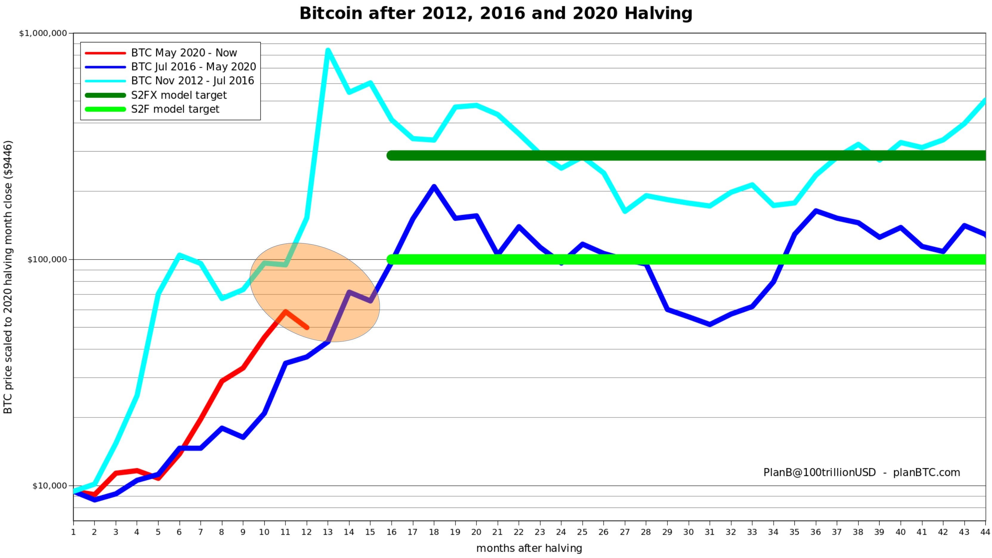 I decided i’m going to write one of these every time Bitcoin has a significant correction. It’s also easier for me to type out a single, thoughtful, article rather than answering 20 individual messages. This week, Bitcoin and the crypto markets experienced a pretty significant flash crash. We’re currently sitting at $50,500, down 21% from the all time highs of $64,000. I’ve written about this multiple times but i’ll continue to write it… 30% price corrections are common in Bitcoin bull markets. The 2017 market cycle had 7 separate price corrections, and so far, we’ve had 4 this market cycle. The graph above shows the three cycles on top of each other and, as you can see, we’re right on schedule. Once again, i’ll use my trusted framework to digest the current market volatility.
